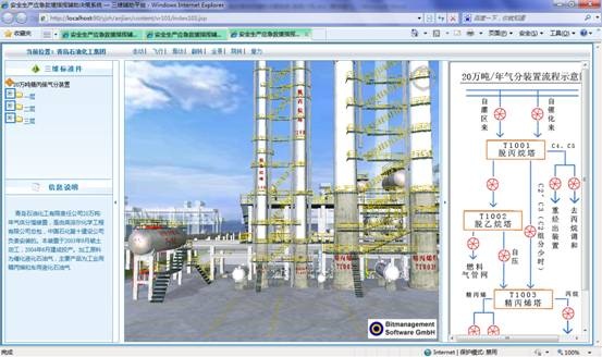 系統(tǒng)集成三維模型子系統(tǒng),根據(jù)企業(yè)名稱或者關(guān)鍵設(shè)備智能關(guān)聯(lián)到三維模型頁面。如下圖所示,左側(cè)菜單顯示當前企業(yè)所有的三維模型標準件,右側(cè)顯示裝置生產(chǎn)流程示意圖,點擊菜單或者流程圖節(jié)點皆可直接切換到相關(guān)視點。