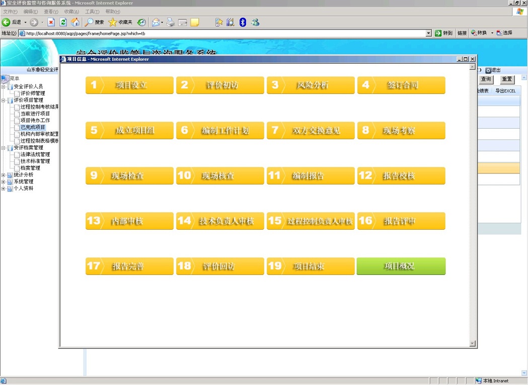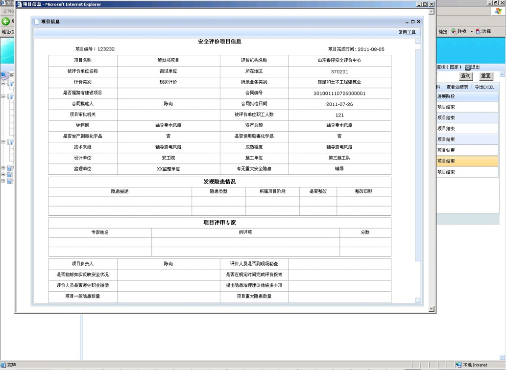 按照安評過程控制標準,結(jié)合安全評價機構(gòu)的日常工作流程,對安全評價整個過程進行網(wǎng)絡(luò)化地控制和監(jiān)管,根據(jù)風險分析、實施評價、報告審核、技術(shù)支撐、作業(yè)文件、內(nèi)部管理、檔案管理和檢查改進八要素對所有評價項目過程進行嚴格把關(guān),要求安全評價機構(gòu)將現(xiàn)有項目的進度情況及時上報到系統(tǒng)中,規(guī)范安全評價機構(gòu)工作流程,實現(xiàn)安全評價過程控制的信息化,在方便安全評價機構(gòu)內(nèi)部管理的同時有利于監(jiān)管部門對安全評價機構(gòu)的評價行為進行實時動態(tài)的監(jiān)督管理。
