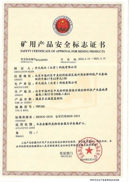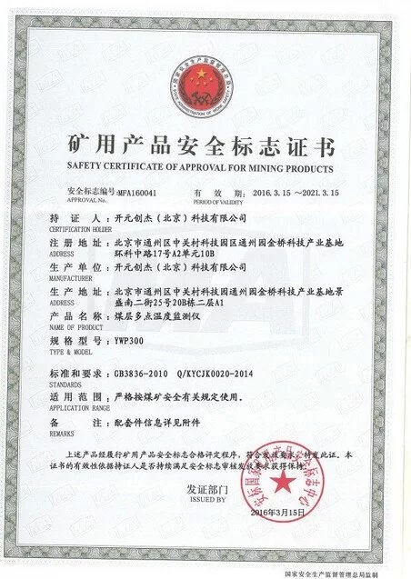 YWP300煤層多點溫度檢測儀取得安標(biāo)認(rèn)證