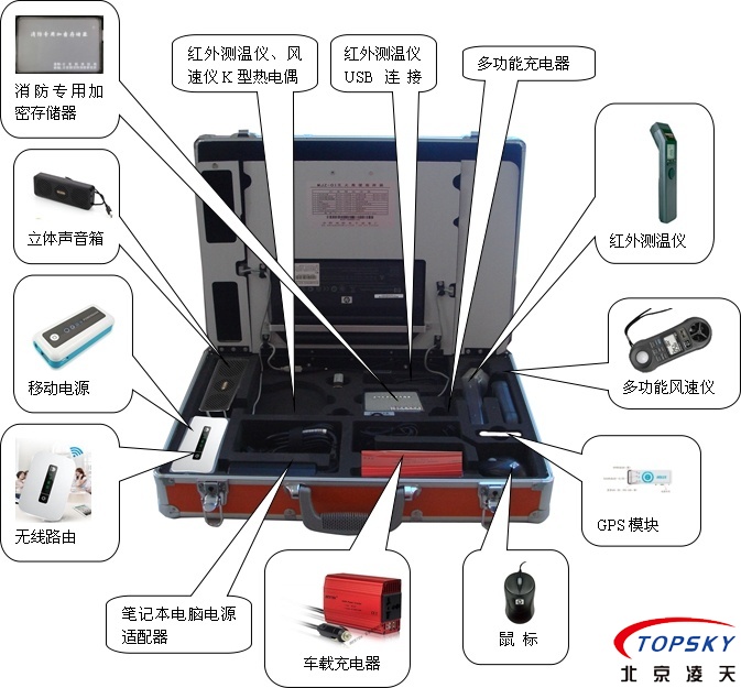 整套設(shè)備包括:筆記本電腦、紅外測溫儀、多功能風(fēng)速儀、GPS模塊、消防專用加密存儲器、立體聲音箱、無線路由器、電源系統(tǒng)、鼠標(biāo)、車載充電器、移動(dòng)電源、筆記本電腦適配器、便攜箱、防水迷彩袋;