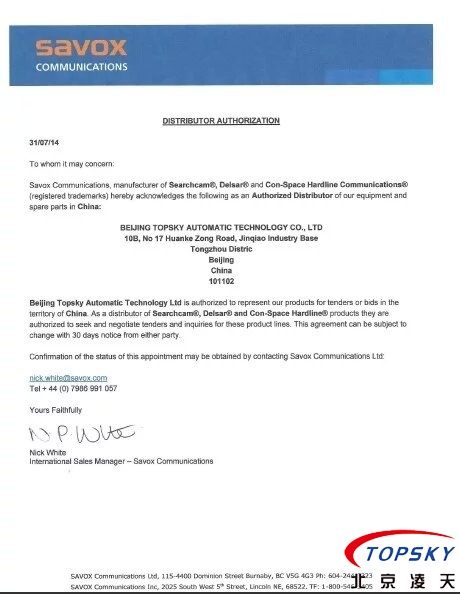 美國SAVOX視頻,音頻探測儀授權(quán)書
