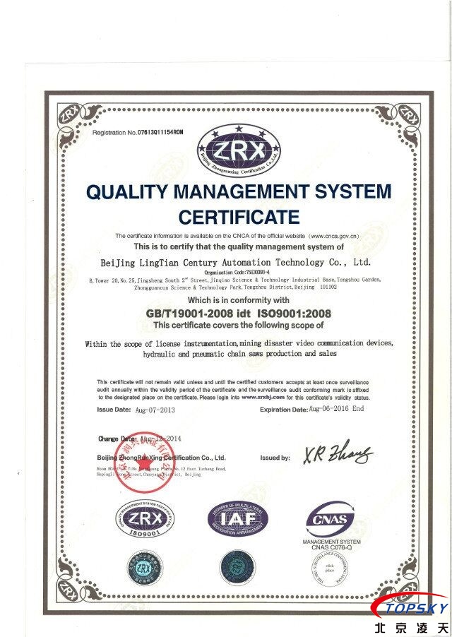 經(jīng)過嚴(yán)格的評(píng)審,我司近期按照GB/T19001-2008質(zhì)量管理體系要求,已經(jīng)取得ISO9001質(zhì)量管理體系認(rèn)證,認(rèn)證的獲得,標(biāo)志著我司在管理體系上已經(jīng)具備較高水平。認(rèn)證證書的中英文如下: