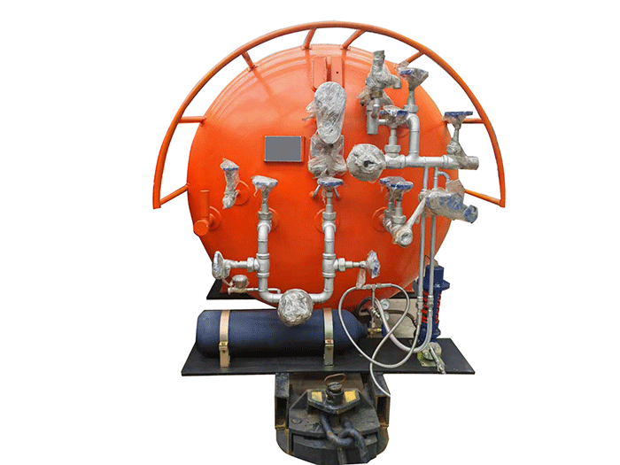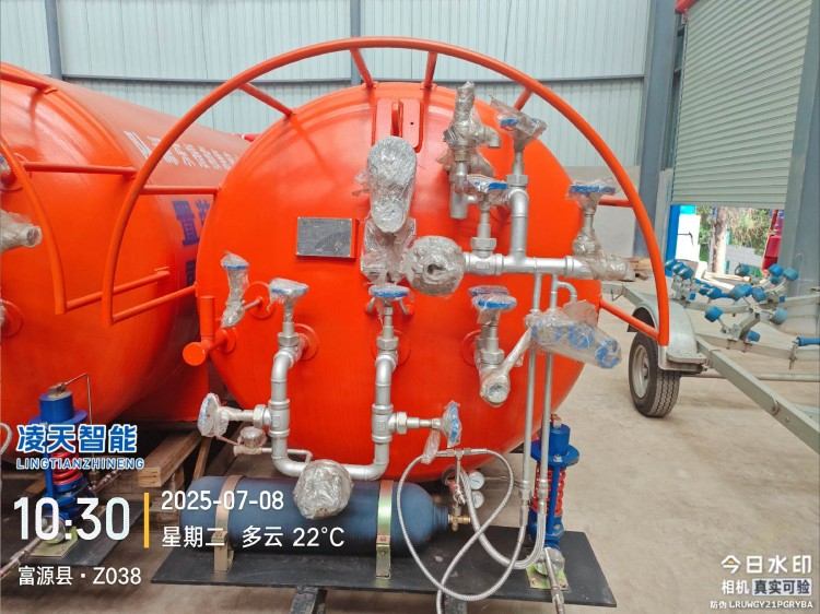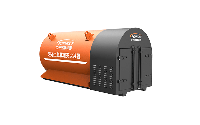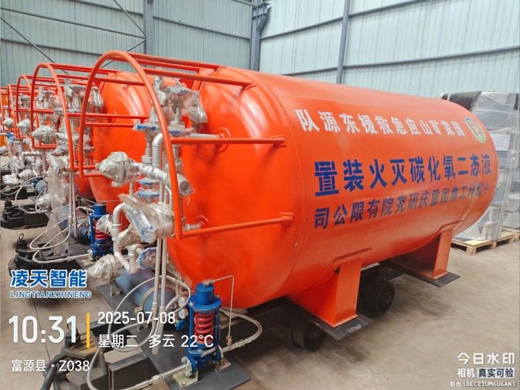 液態(tài)二氧化碳滅火裝置,采用平板車(chē)為運(yùn)載平臺(tái),搭載液態(tài)二氧化碳滅火模塊,采用液態(tài)二氧化碳為滅火劑,運(yùn)輸至井下火區(qū)近附,經(jīng)自增壓調(diào)控系統(tǒng)實(shí)現(xiàn)罐內(nèi)穩(wěn)壓,并通過(guò)遠(yuǎn)距離輸送管路將液體從罐內(nèi)向密閉火區(qū)噴射,利用其急速膨脹氣化和吸熱效率高的物理特性,可實(shí)現(xiàn)惰性降氧,吸熱降溫,吸附阻化等功能,從而可快速進(jìn)行井下煤層自燃火災(zāi)的預(yù)防與撲滅等。