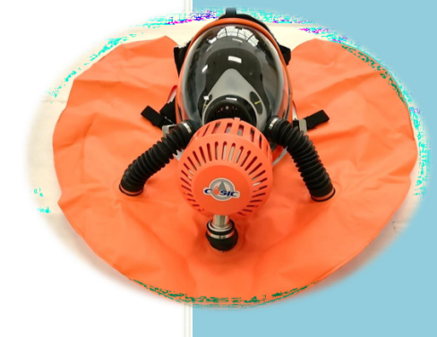 遇到緊急情況或者需要隔絕式防護的應急場合,使用人員應按佩戴的要求迅速戴上呼吸面罩,并根據(jù)個人臉型調(diào)整呼吸面罩上的緊固帶松緊程度,并佩戴緊固。人員呼出的低氧氣含量(17%左右)、高二氧化碳含量(4.5%左右)的氣體通過呼吸面罩的單向出氣口進入空氣再生罐。在空氣再生罐內(nèi),呼出氣體中的二氧化碳與生氧劑發(fā)生化學反應產(chǎn)生氧氣。當呼出氣體從空氣再生罐經(jīng)呼吸軟管流入氣囊時已置換成新鮮空氣。新鮮空氣儲存在氣囊中,人體吸氣時產(chǎn)生負壓,新鮮空氣分別沿氣囊左右兩側的呼吸軟管流回面罩內(nèi),完成一次空氣循環(huán)再生;并依次往復循環(huán)下去,連續(xù)不斷地提供人體呼吸所需的新鮮空氣。
