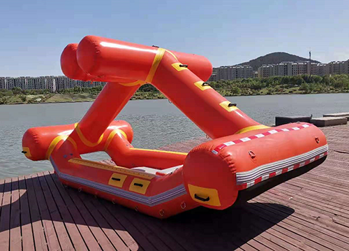 2. ★高處救援:2名成年人站在自扶正激流救生艇頂部,未見頂部氣柱明顯變形和傾倒。