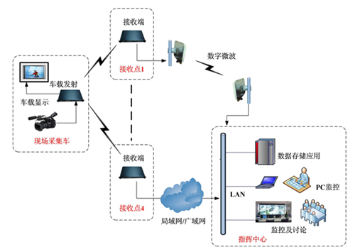前端現場采集車安裝大功率車載設備在城市各區(qū)內巡邏,實時將采集的音視頻信息傳給就近接收點,接收點用微波、光纖或專網等設施傳輸給指揮中心。
