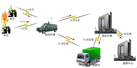 前端人員背負單兵設備采集音視頻信號傳給移動中繼車,車上的接收合并采集信息后并對接車載(中繼)設備。由中繼接力發(fā)射 ,從而形成約30公里左右距離的 應急通信鏈路,直至指揮中心。